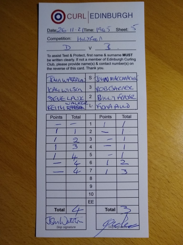 With skip Alice marooned over the bridges by Storm Arwen, John W. was standing in as skip with the remainder of the five-handed rink all present and correct. Team MacConnachie too had a full turn-out so the scene was set for a titanic battle.