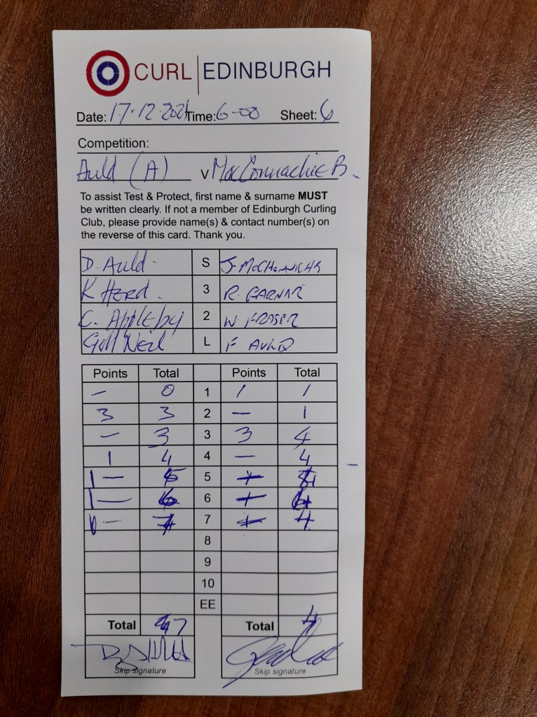 Cracking game – any one could have won but this time the Curling Gods favoured Team A.