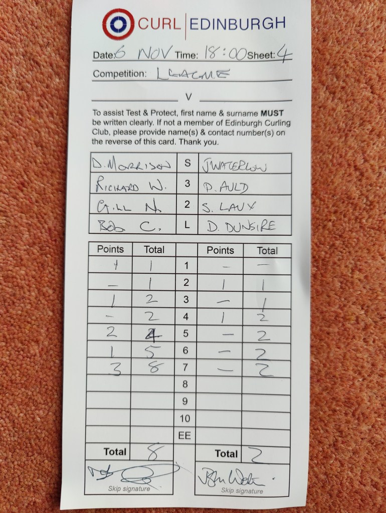 The bell being rung, handshakes were made with congratulations all round for a keenly contested game and then we all retired to the rejuvenated bar to enjoy the new facilities for the much missed ‘Après curl’ experience when jovial banter was the order of the day – life at the rink has returned to something akin to ‘times past’.