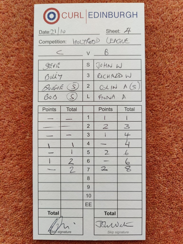 For the seventh and final end and despite some fine deliveries, Team Deemo were at a two stone disadvantage by the time Skip JW was due to take his final stone – there was little to be gained by risking going for a three so he stuck his final stone up his metaphorical jumper and shook hands to finish an enjoyable game.