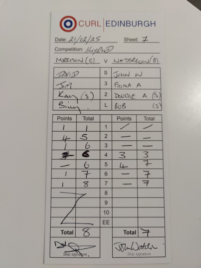 Rink ‘Deemo’ collectively stood behind the head holding their breath as the stone was played – it looked to be on line and good weight but it just managed to miss the draw and slid to the back of the house and out of contention – rink ‘Deemo’ took a single shot to win the game 8 shots to 7. PHEW!