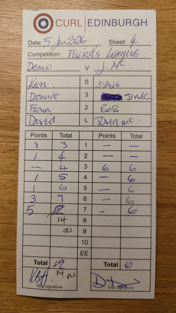 First end we managed to steal three and the second managed to hold onto a single. Third end a disaster. Two well placed blue stones were disposed of in one fell swoop leaving us bereft of stones in the house. Attempts by Constable in third to remedy the situation failed miserably with nothing in play. It remained to yours truly to save the situation which resulted in first stone going off line and into the realms of Outer Mongolia, and the final stone sailing through a sea of yellow without effect. Dave’s final stone compounded the embarrassment with another stone in the house. Six against.