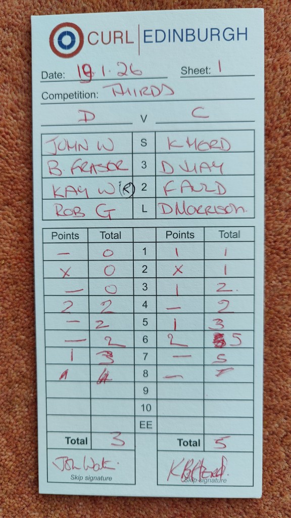 Team D fielded Special K in support of their three-man team and put us on the back foot by winning the toss. We led with blue and with well-placed stones early on, efforts were made to prevent Tides Out from attacking our single lying shot. Achieved, a steal of one.