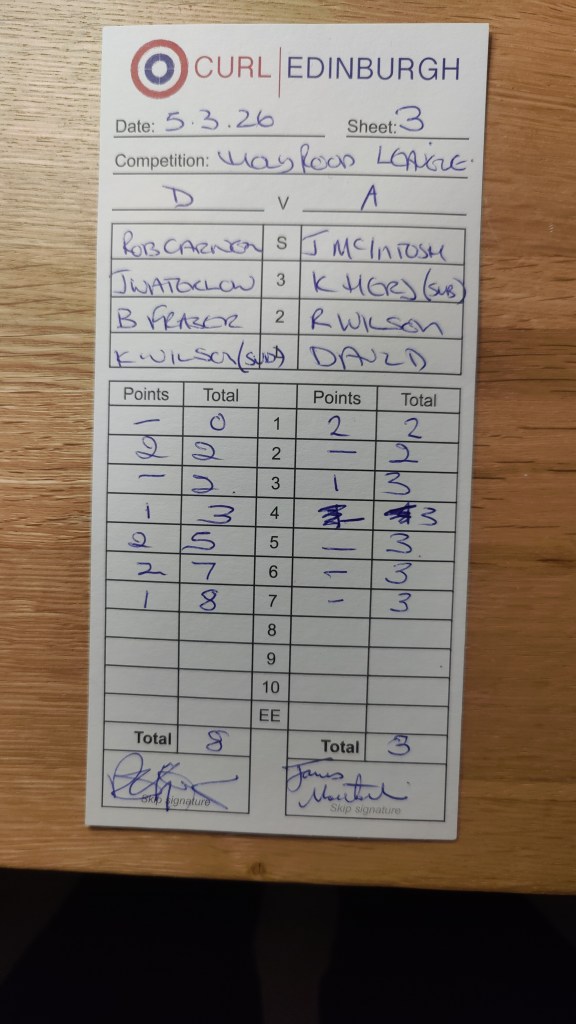 Team A (Jim Craig) vs Team D (Rob Garner) 5th March 2026 Posted byholyroodcurlingclub9th Mar 2026Posted inUncategorized Share this: Share on X (Opens in new window) X Share on Facebook (Opens in new window) Facebook Like Loading... Related