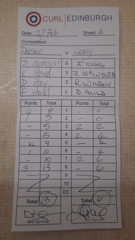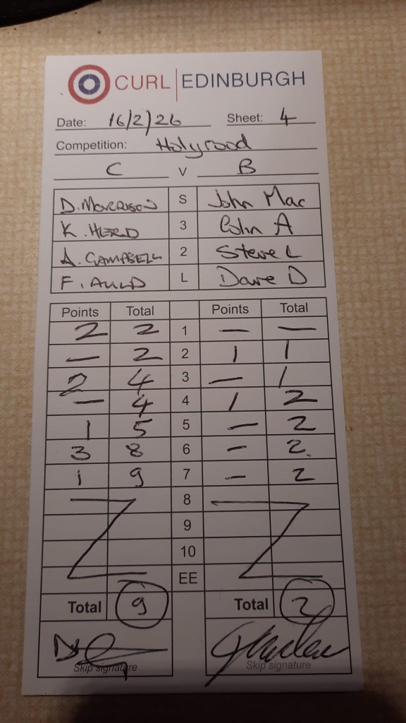 We managed to complete six exercises in our two hours on the ice, exactly the same as last year. This was perhaps surprising given that our session coincided with the Olympic curling semi-final with Great Britain playing Switzerland and being shown on the TV upstairs. It was a tense game and a number of our players were rushing upstairs between goes to keep up with the action.