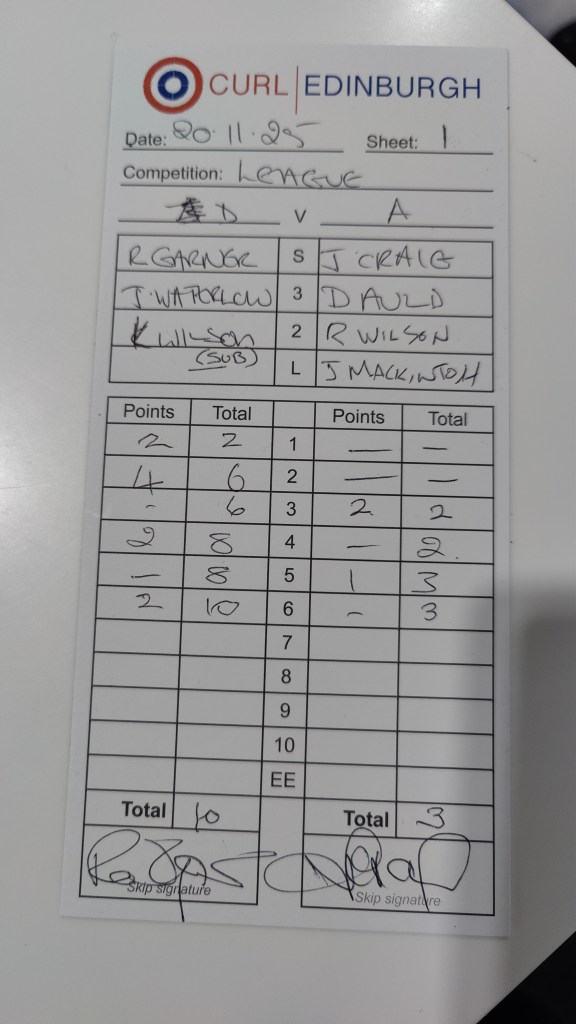 Meanwhile the Edinburgh team of Steve, James, Colin and Rob were playing against Veterans Curling Stirling. Skip Rob reports: “We had a good game, but ended up just losing 6-5 sadly. They took the first three ends (so much for home ice!), then we took the next three ends to reach 5 -5. A game of two halves. In the decider final end I missed a take-out with my final stone, drat. Still, a good tight game.”
