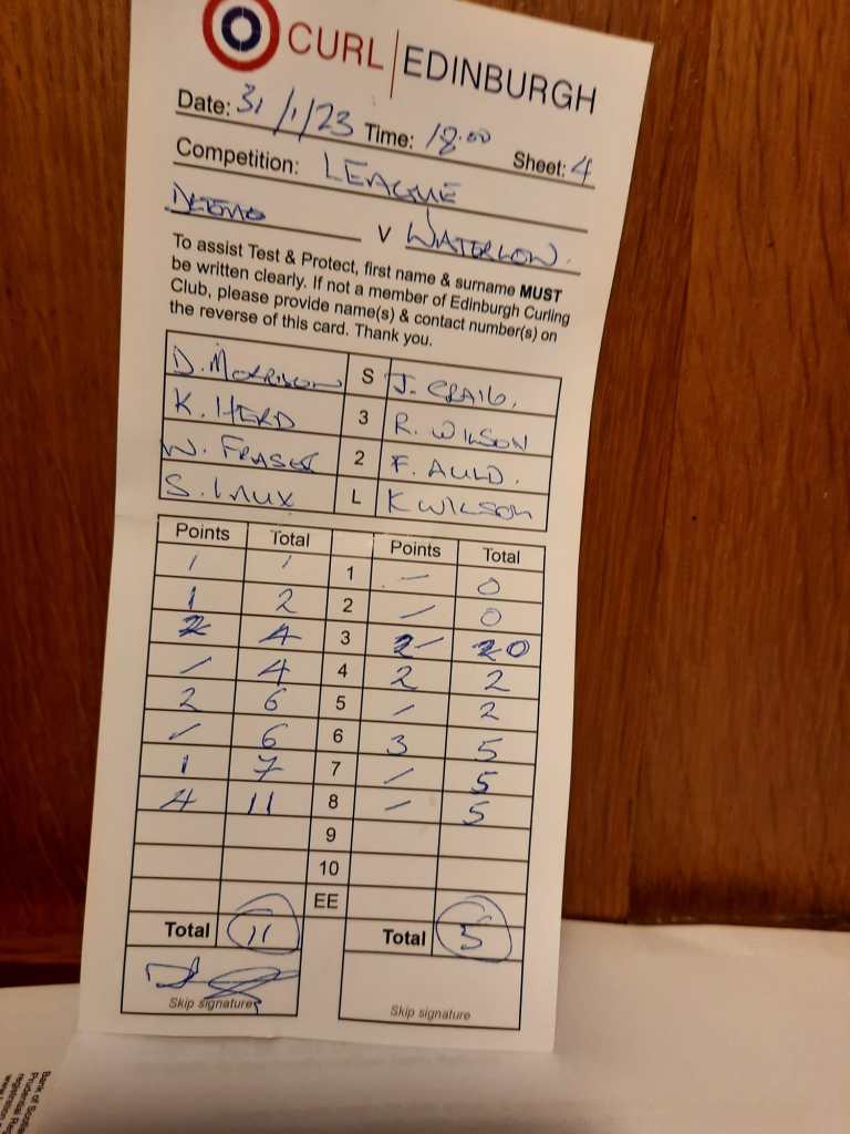 Overall, it was an excellent game played in the good-hearted tradition of Holyrood Curling Club. It’s just a pity that there still aren’t the facilities to allow us to repair to the bar for that much-needed post mortem on the game.